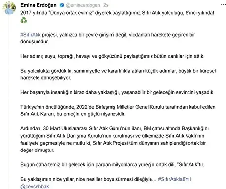 Cumhurbaşkanı Recep Tayyip Erdoğan’ın eşi Emine Erdoğan, sosyal medya hesabından yaptığı paylaşımda, çevre ve Sıfır Atık konusunda dünyanın en kapsamlı buluşmalarından birine ev sahipliği yapacak olmanın heyecanı ve gururu içerisinde olduklarını belirtti.